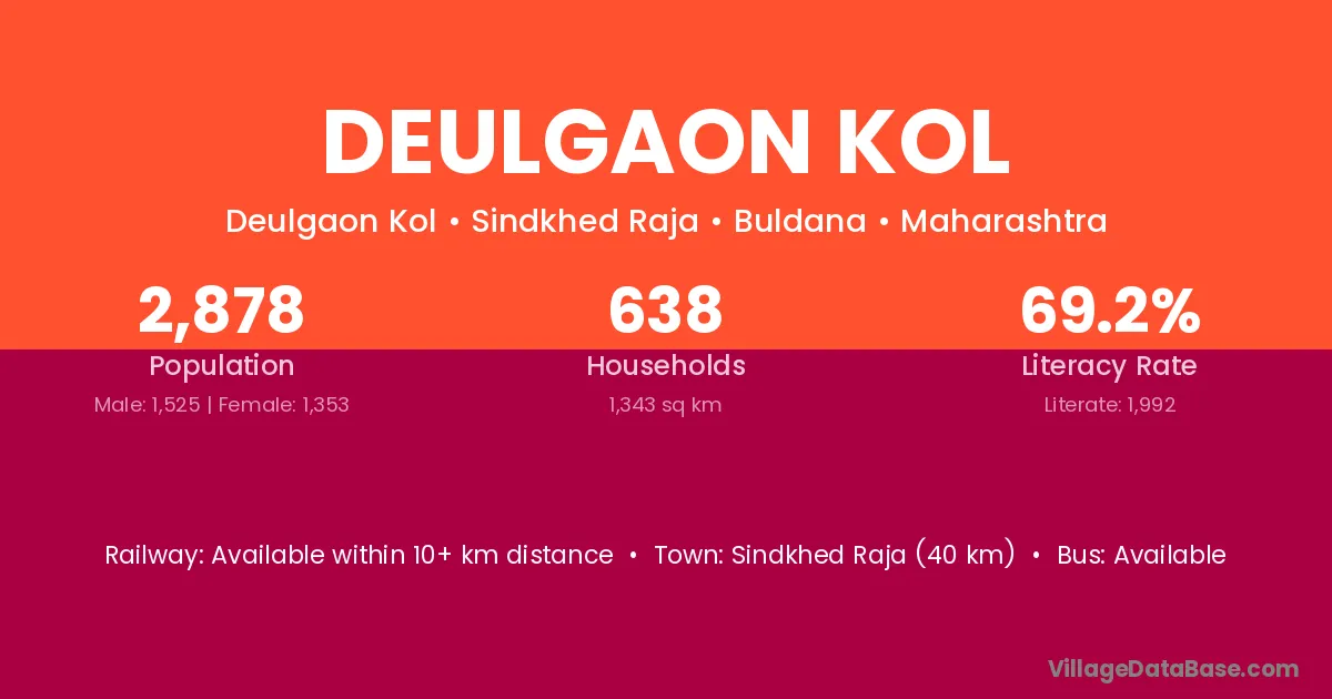 Sindkhed Raja (40 km) is the nearest town to Deulgaon Kol village for major economic activities and is located approximately 40 km away.