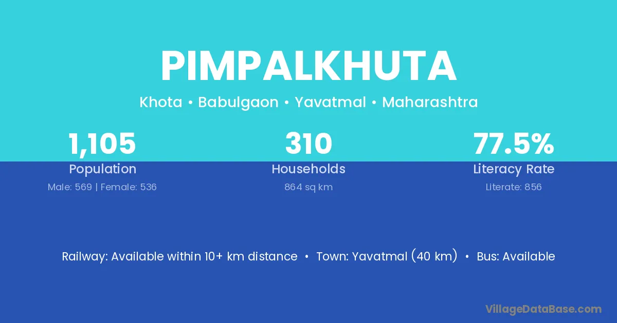 Pimpalkhuta village has a total population of 865 people, of which 457 are males and 408 are females.