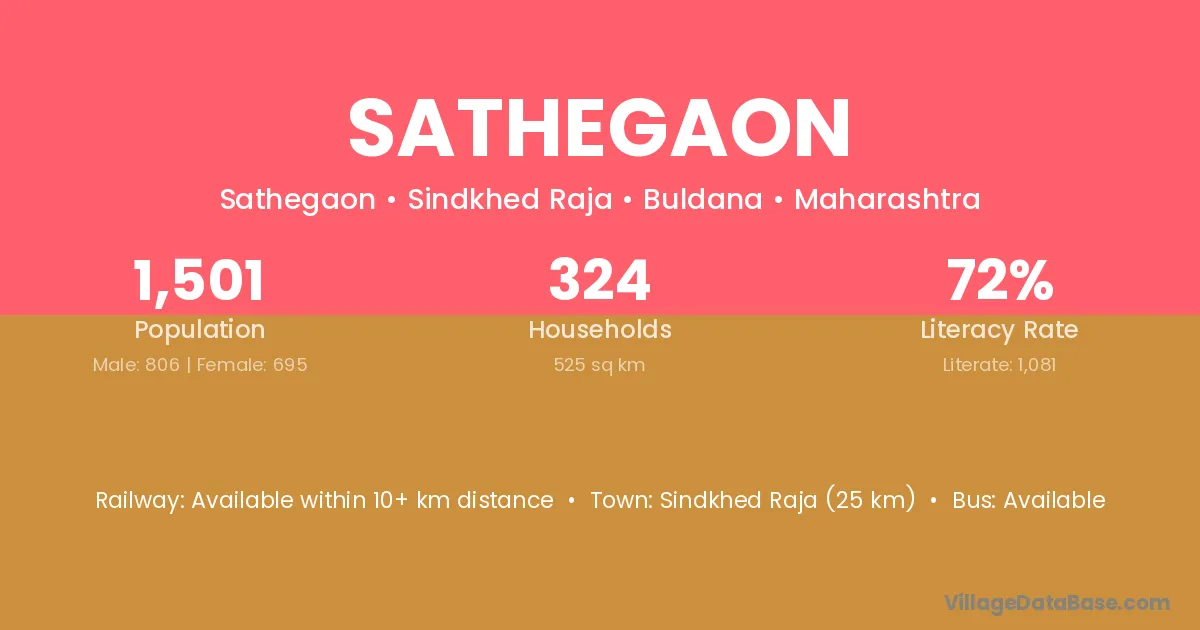 Sindkhed Raja (25 km) is the nearest town to Sathegaon village for major economic activities and is located approximately 25 km away.