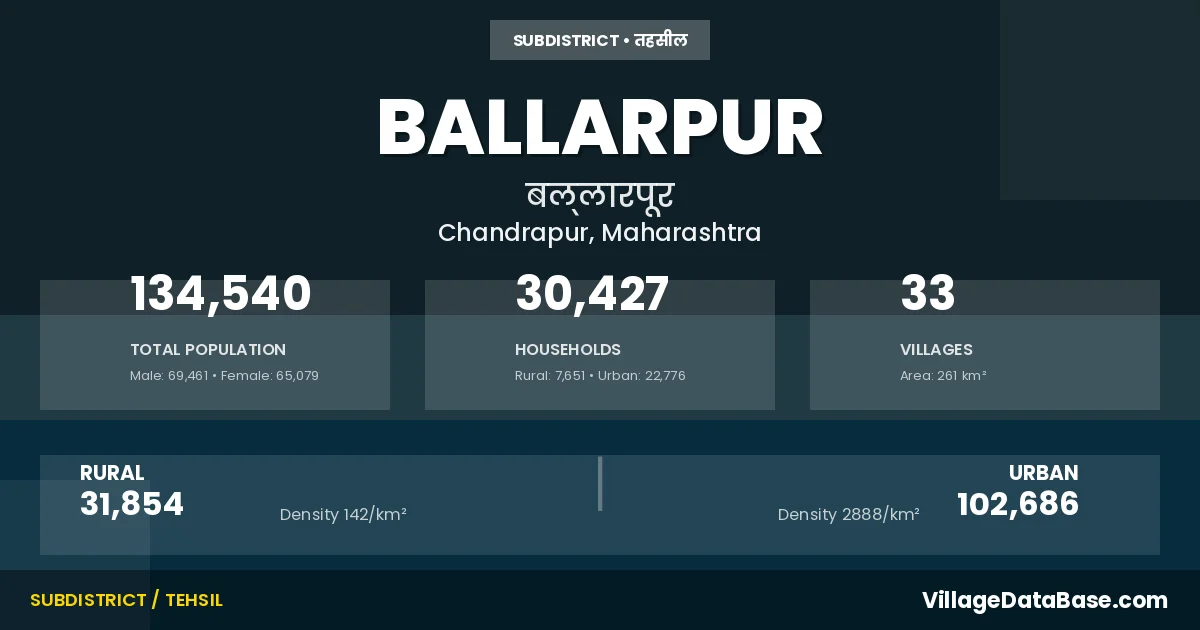 According to the 2011 census The total area of Ballarpur Tehsil is 261 km², with a population of 134540 people. The population density is 516 inhabitants per square kilometre, and there are approximately 30427 houses in the sub district.