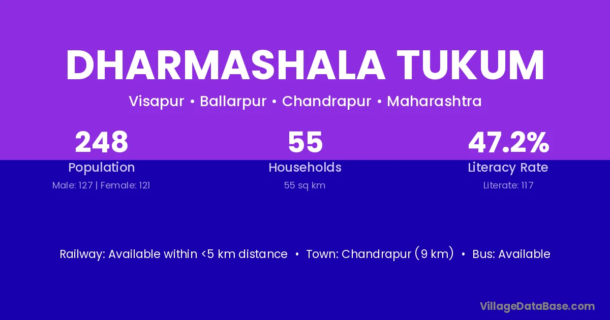 Chandrapur (9 km) is the nearest town to Dharmashala Tukum village for major economic activities and is located approximately 9 km away.