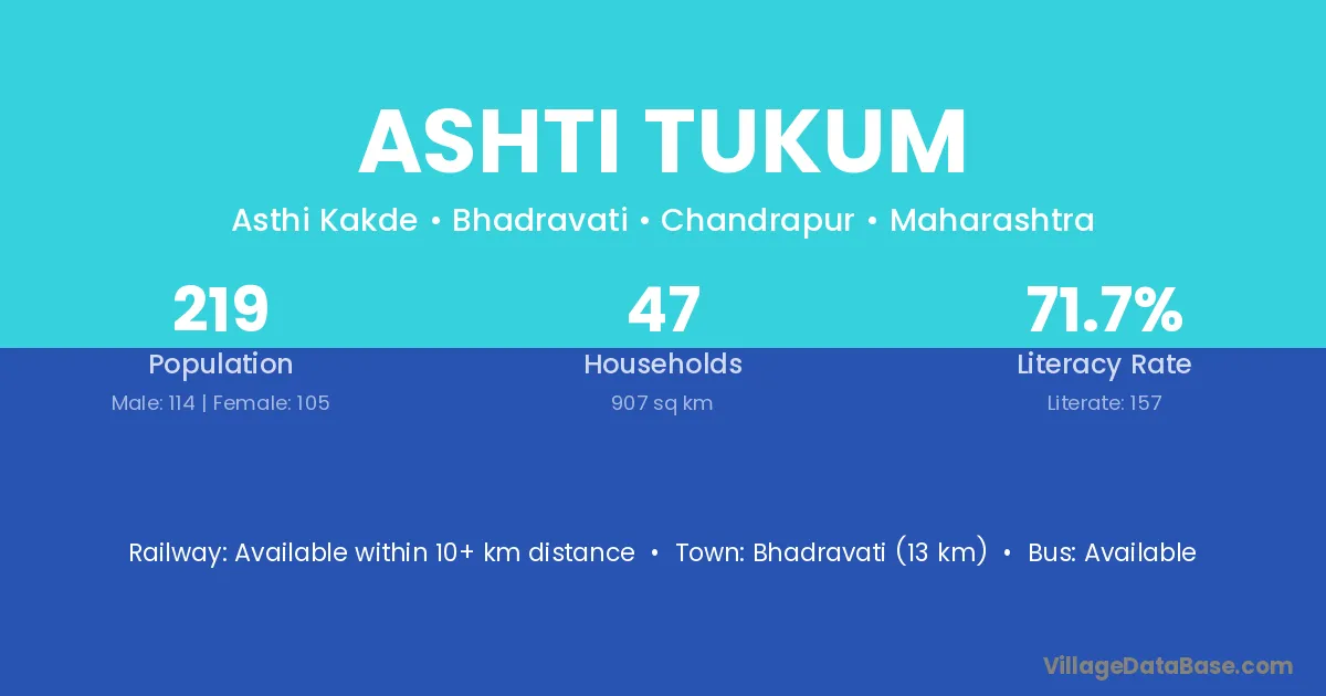 Bhadravati (13 km) is the nearest town to Ashti Tukum village for major economic activities and is located approximately 13 km away.