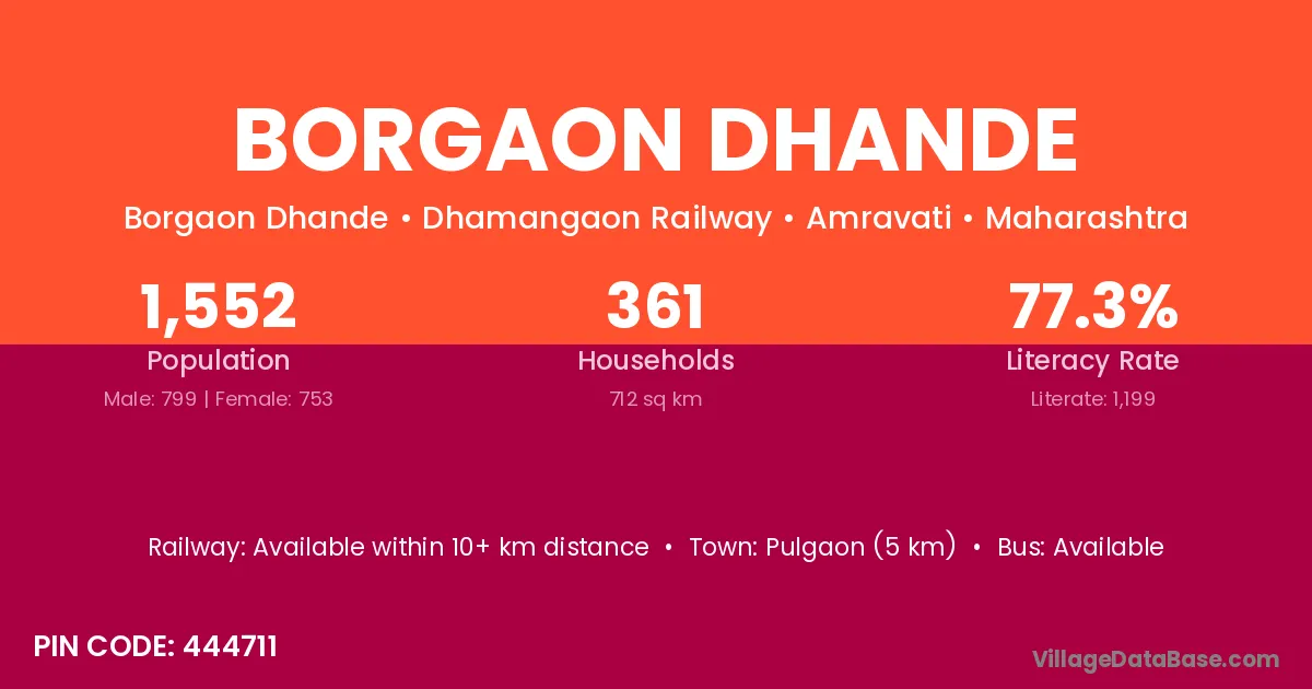 Warora (30 km) is the nearest town to Borgaon Dhande village for major economic activities and is located approximately 30 km away.