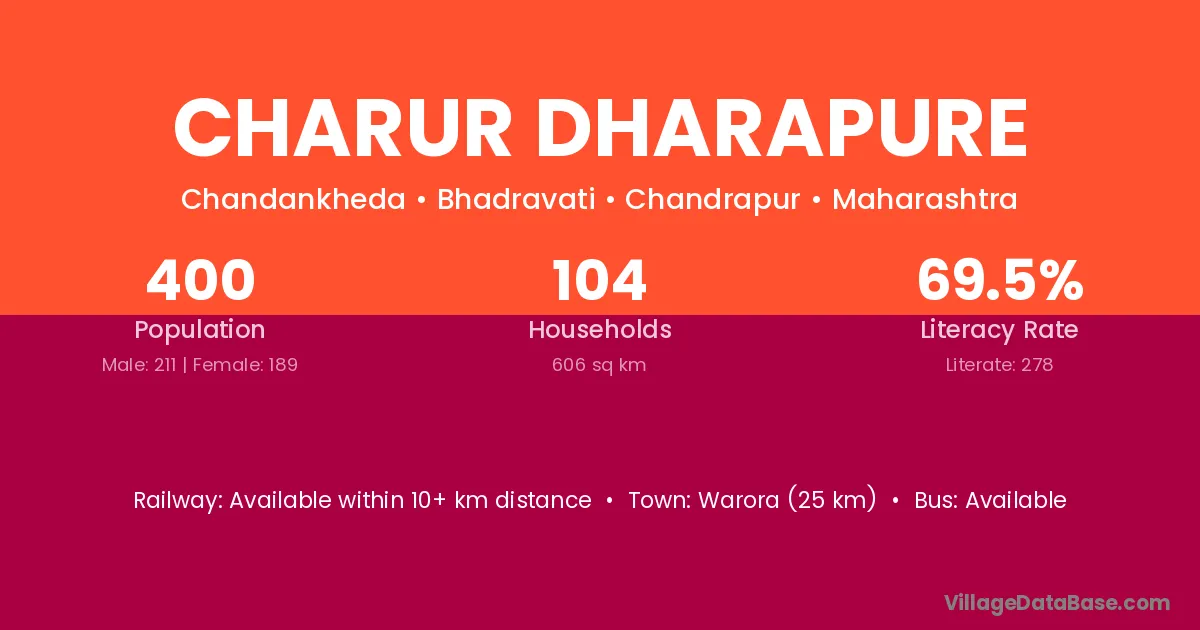 Warora (25 km) is the nearest town to Charur Dharapure village for major economic activities and is located approximately 25 km away.