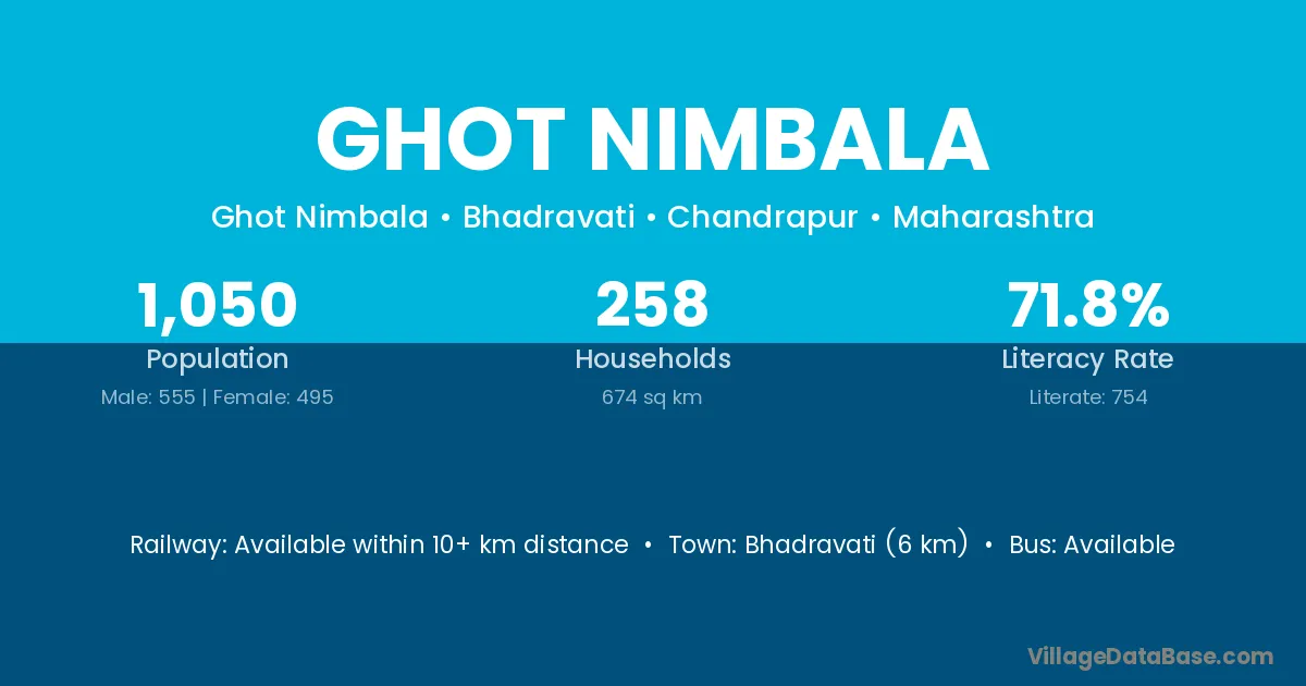 Bhadravati (6 km) is the nearest town to Ghot Nimbala village for major economic activities and is located approximately 6 km away.