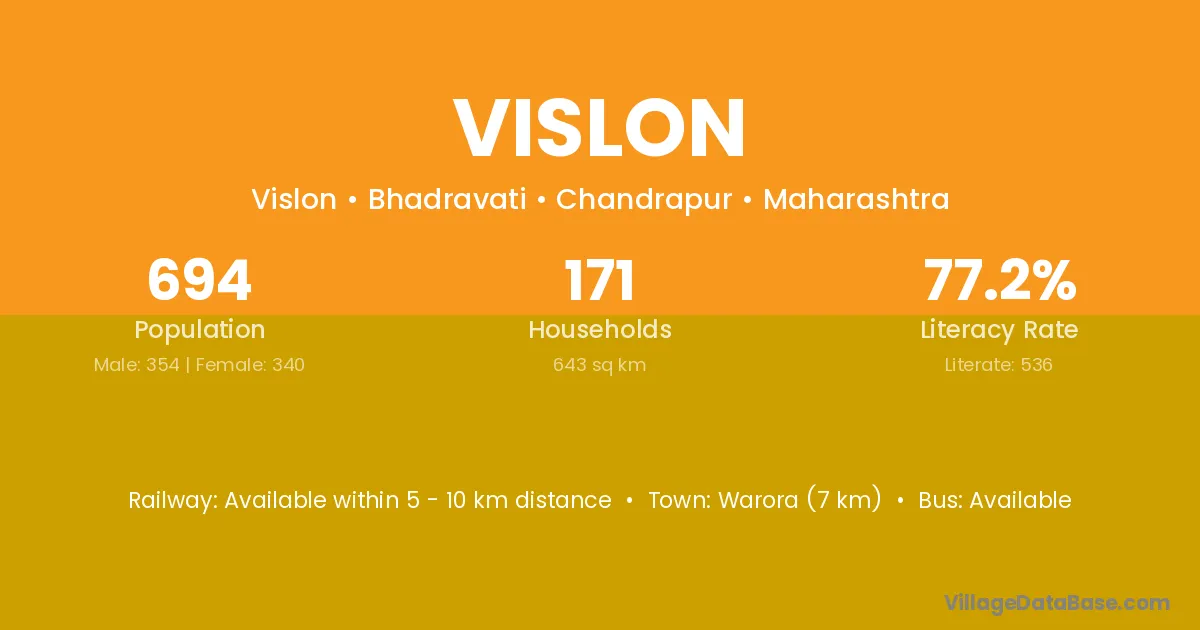 Warora (7 km) is the nearest town to Vislon village for major economic activities and is located approximately 7 km away.