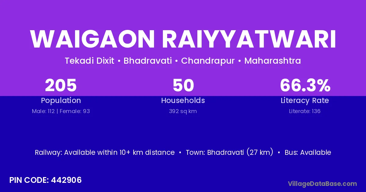 Bhadravati (27 km) is the nearest town to Waigaon Raiyyatwari village for major economic activities and is located approximately 27 km away.