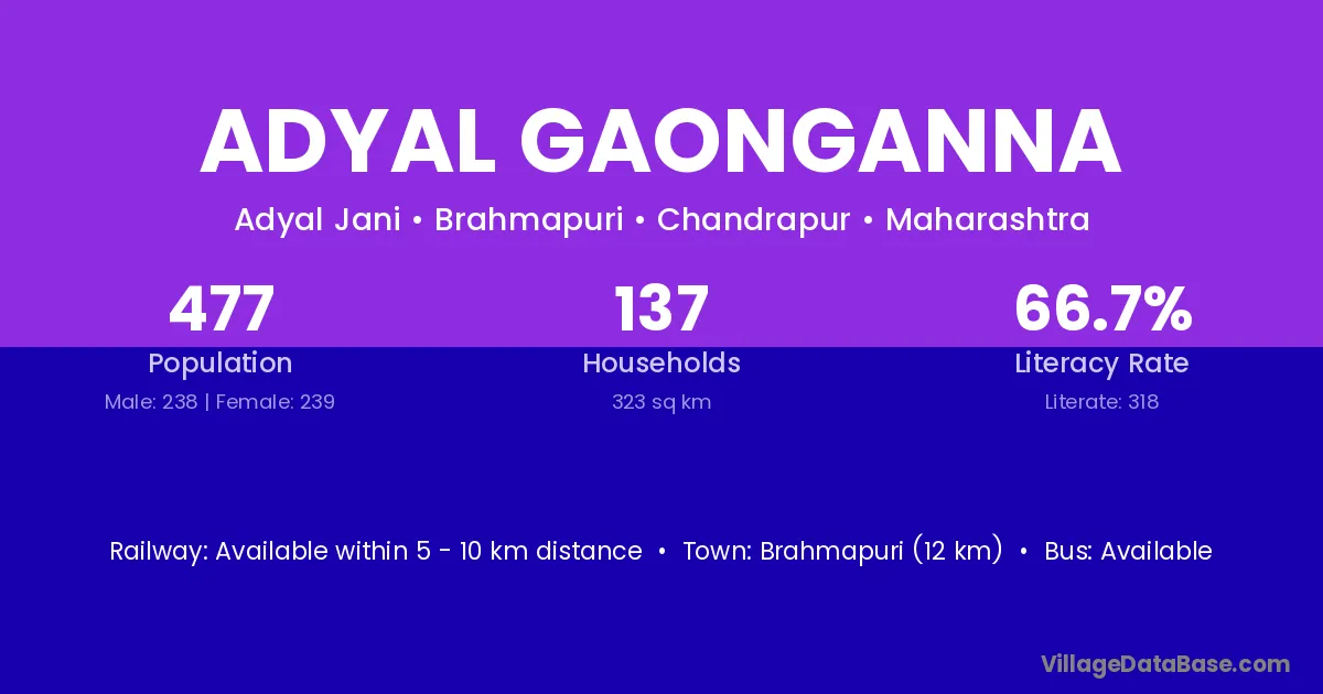 Brahmapuri (12 km) is the nearest town to Adyal Gaonganna village for major economic activities and is located approximately 12 km away.