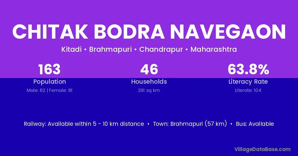 Brahmapuri (57 km) is the nearest town to Chitak Bodra Navegaon village for major economic activities and is located approximately 57 km away.