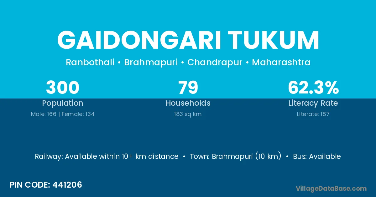 Brahmapuri (10 km) is the nearest town to Gaidongari Tukum village for major economic activities and is located approximately 10 km away.