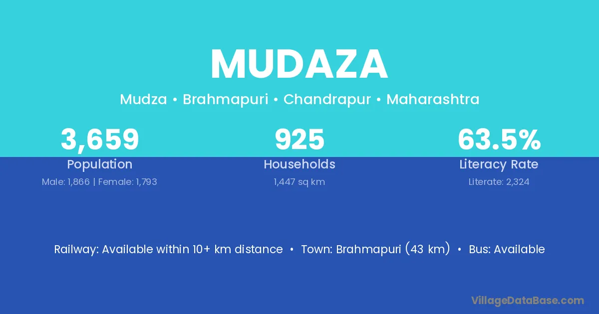 Brahmapuri (43 km) is the nearest town to Mudaza village for major economic activities and is located approximately 43 km away.