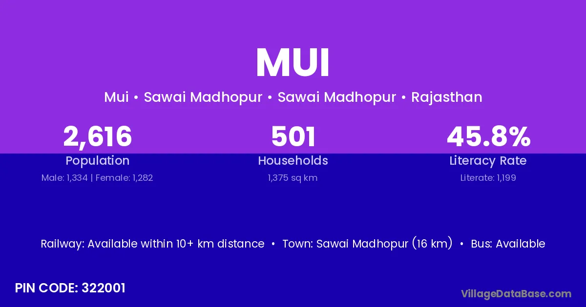 The literacy rate of Mui village is 66.48%. Male literacy stands at 75.00% and female literacy at 57.95%.