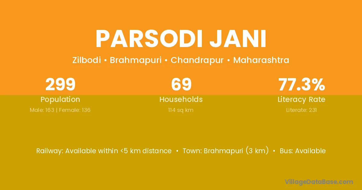 Brahmapuri (3 km) is the nearest town to Parsodi Jani village for major economic activities and is located approximately 3 km away.