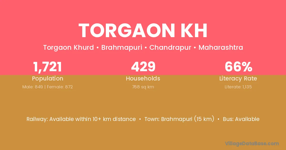 Brahmapuri (15 km) is the nearest town to Torgaon Kh village for major economic activities and is located approximately 15 km away.