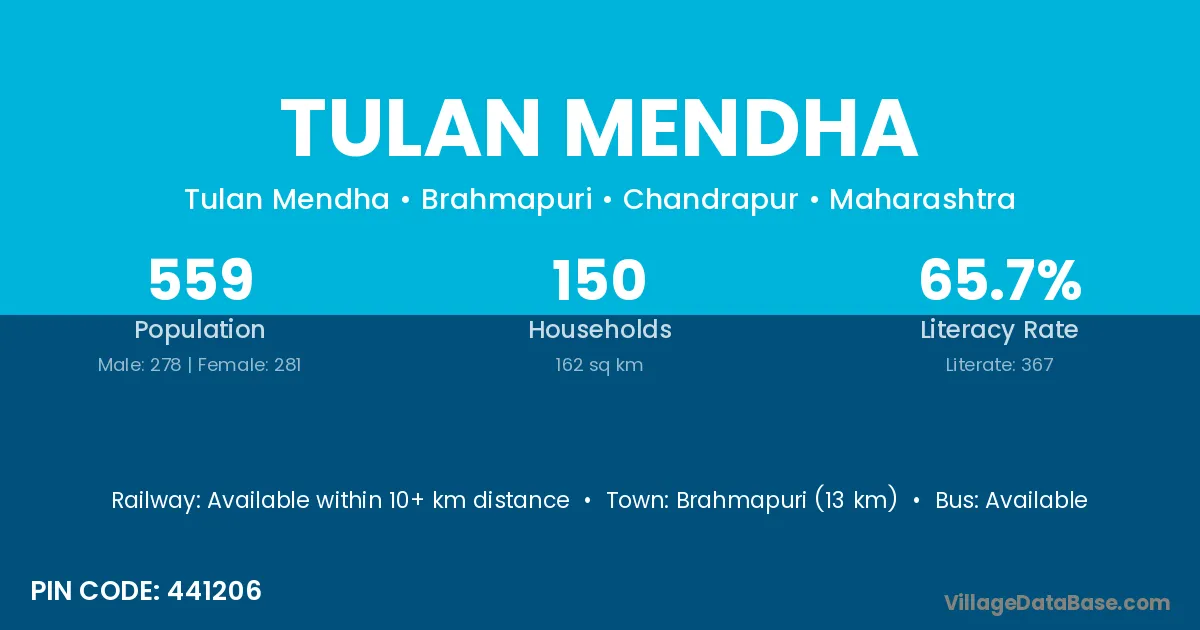 Brahmapuri (13 km) is the nearest town to Tulan Mendha village for major economic activities and is located approximately 13 km away.