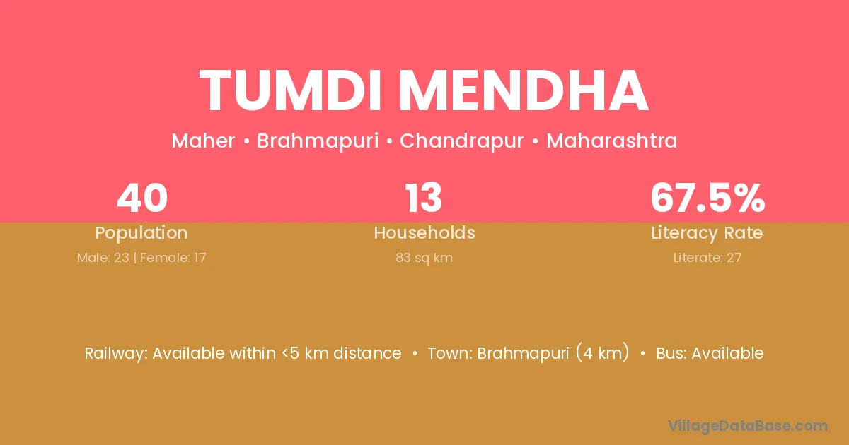 Brahmapuri (4 km) is the nearest town to Tumdi Mendha village for major economic activities and is located approximately 4 km away.