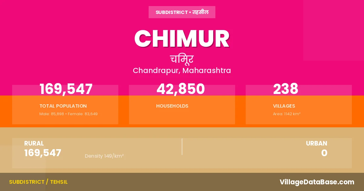 According to the 2011 census The total area of Chimur Tehsil is 1142 km², with a population of 169547 people. The population density is 149 inhabitants per square kilometre, and there are approximately 42850 houses in the sub district.