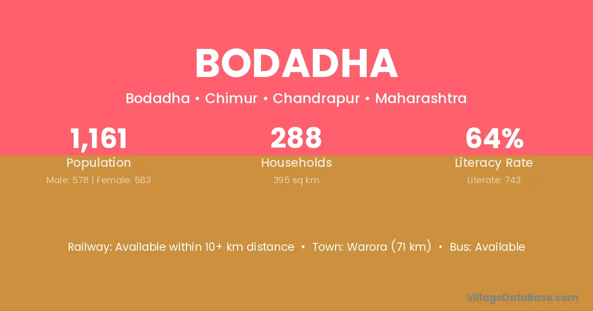 Warora (71 km) is the nearest town to Bodadha village for major economic activities and is located approximately 71 km away.