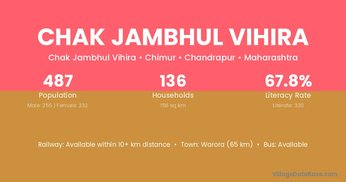 Warora (65 km) is the nearest town to Chak Jambhul Vihira village for major economic activities and is located approximately 65 km away.