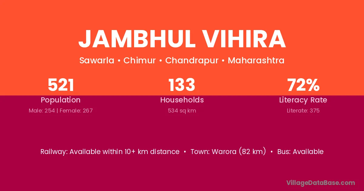 Warora (82 km) is the nearest town to Jambhul Vihira village for major economic activities and is located approximately 82 km away.
