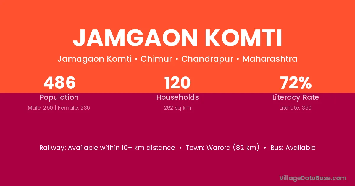 Warora (82 km) is the nearest town to Jamgaon Komti village for major economic activities and is located approximately 82 km away.