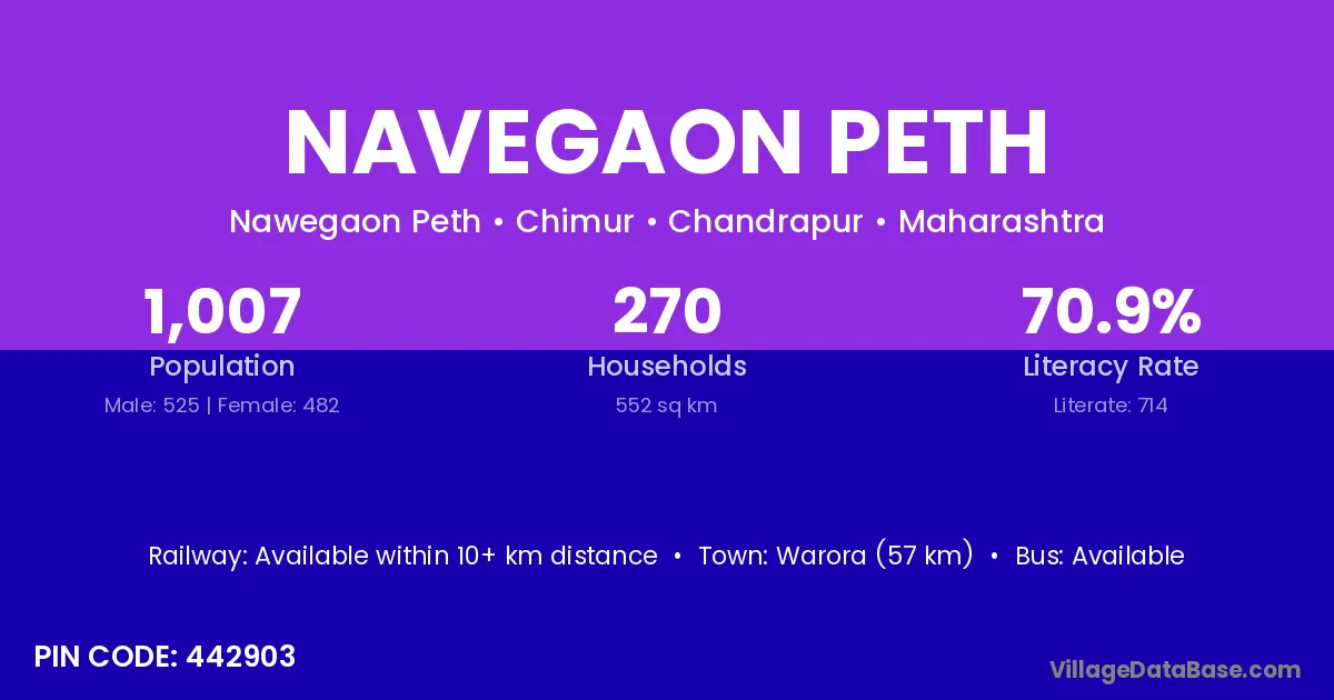 Warora (57 km) is the nearest town to Navegaon Peth village for major economic activities and is located approximately 57 km away.