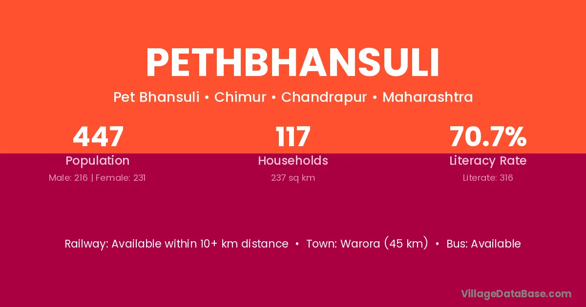 Warora (45 km) is the nearest town to Pethbhansuli village for major economic activities and is located approximately 45 km away.