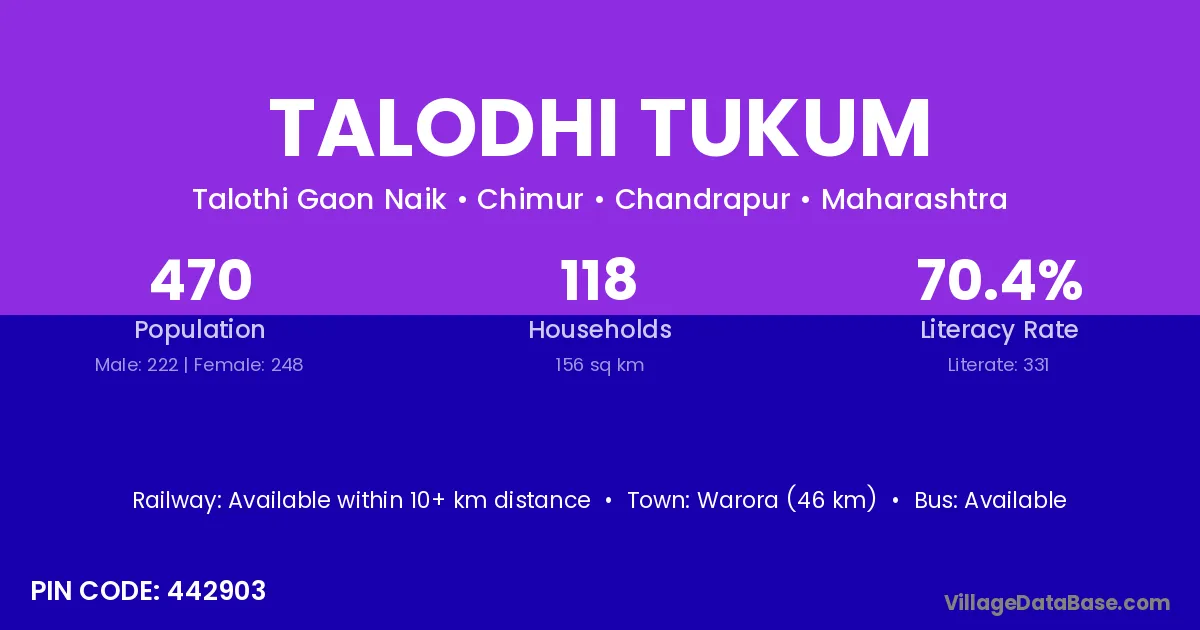Warora (46 km) is the nearest town to Talodhi Tukum village for major economic activities and is located approximately 46 km away.