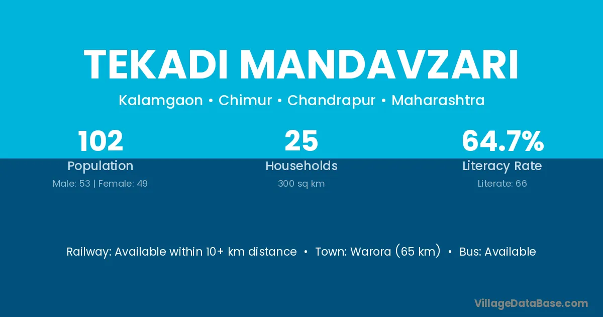 Warora (65 km) is the nearest town to Tekadi Mandavzari village for major economic activities and is located approximately 65 km away.