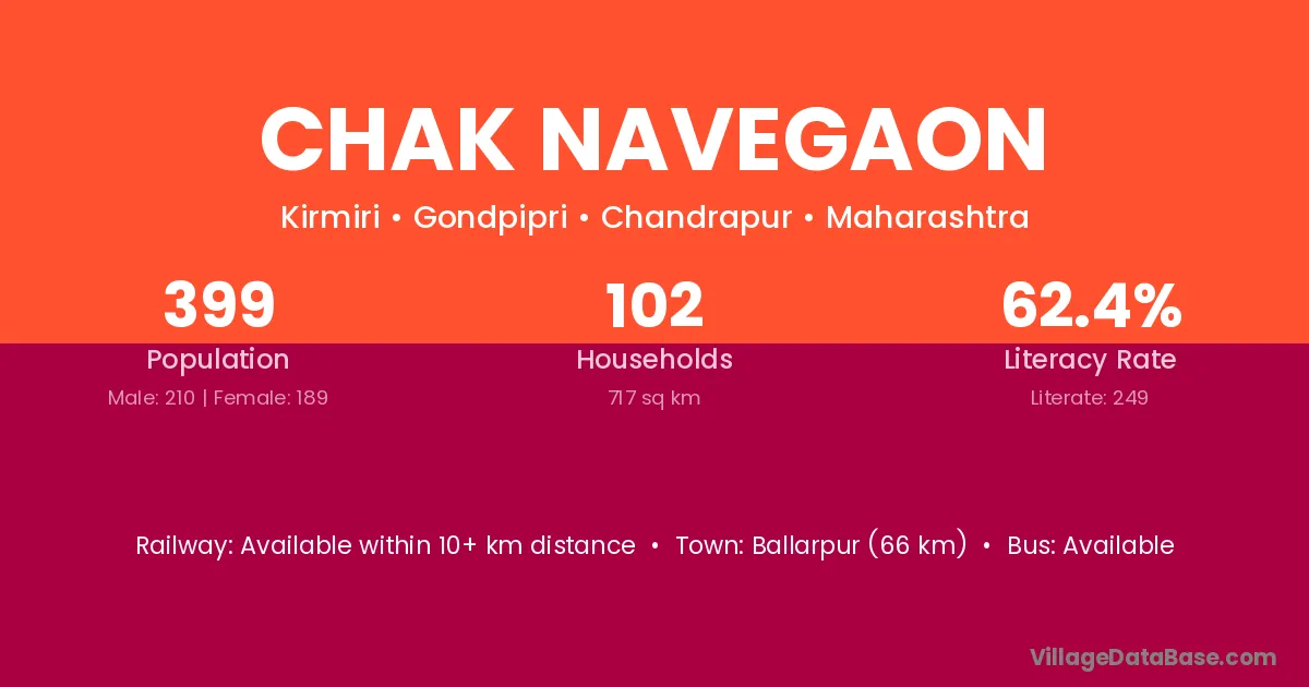 Ballarpur (66 km) is the nearest town to Chak Navegaon village for major economic activities and is located approximately 66 km away.