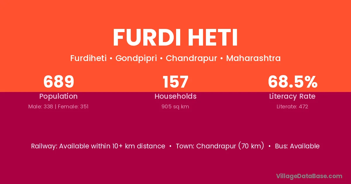 Chandrapur (70 km) is the nearest town to Furdi Heti village for major economic activities and is located approximately 70 km away.