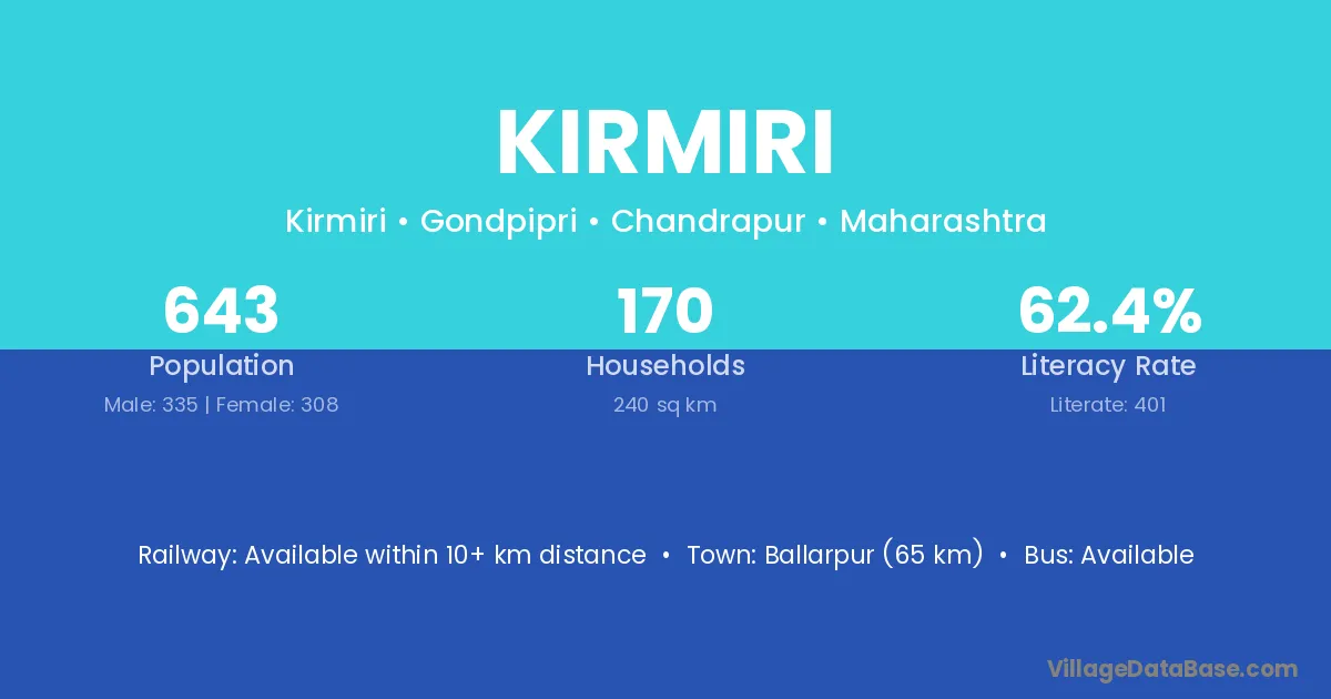 Ballarpur (65 km) is the nearest town to Kirmiri village for major economic activities and is located approximately 65 km away.