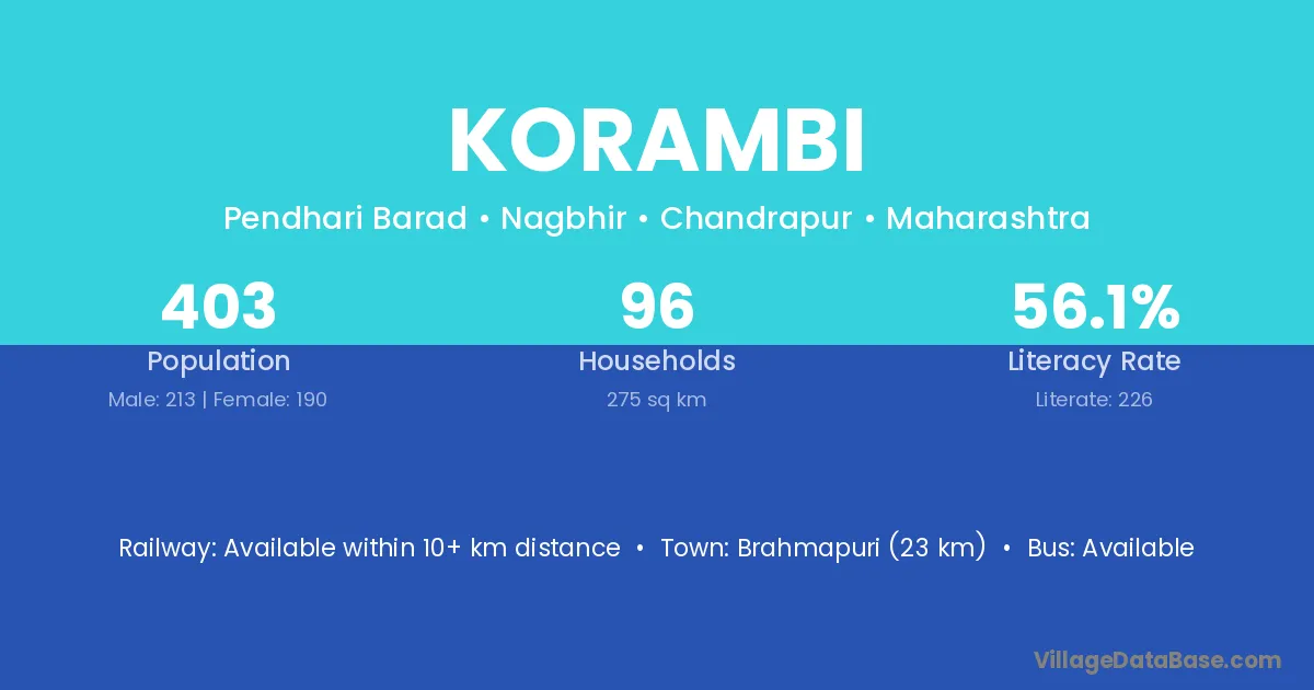 Chandrapur (71 km) is the nearest town to Korambi village for major economic activities and is located approximately 71 km away.