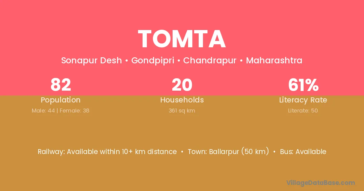 Ballarpur (50 km) is the nearest town to Tomta village for major economic activities and is located approximately 50 km away.
