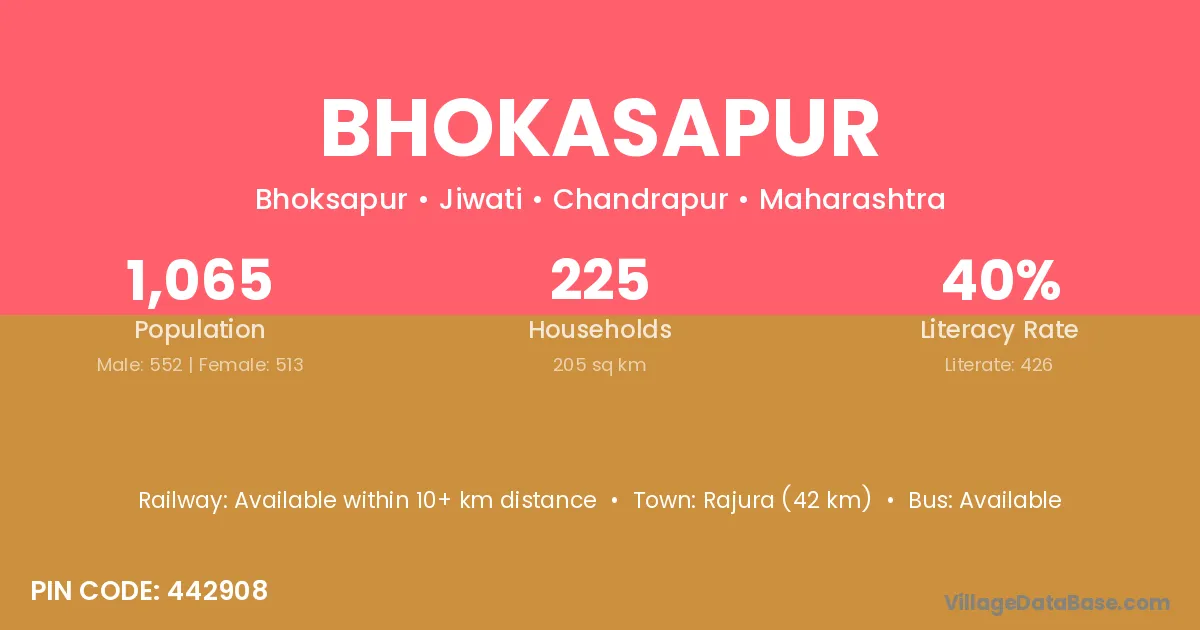 Rajura (42 km) is the nearest town to Bhokasapur village for major economic activities and is located approximately 42 km away.