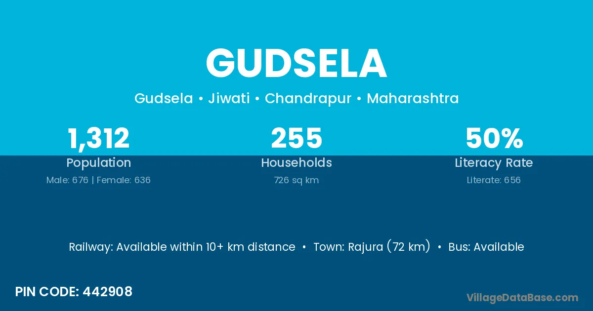 Rajura (72 km) is the nearest town to Gudsela village for major economic activities and is located approximately 72 km away.