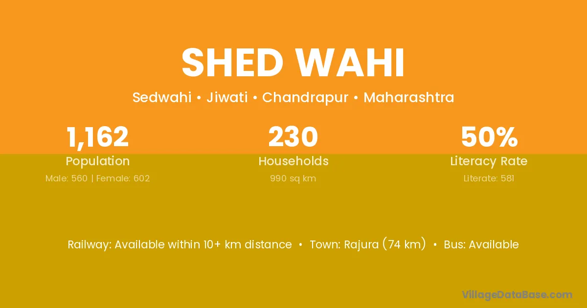 Rajura (74 km) is the nearest town to Shed Wahi village for major economic activities and is located approximately 74 km away.