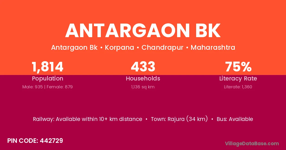 Rajura (34 km) is the nearest town to Antargaon Bk village for major economic activities and is located approximately 34 km away.
