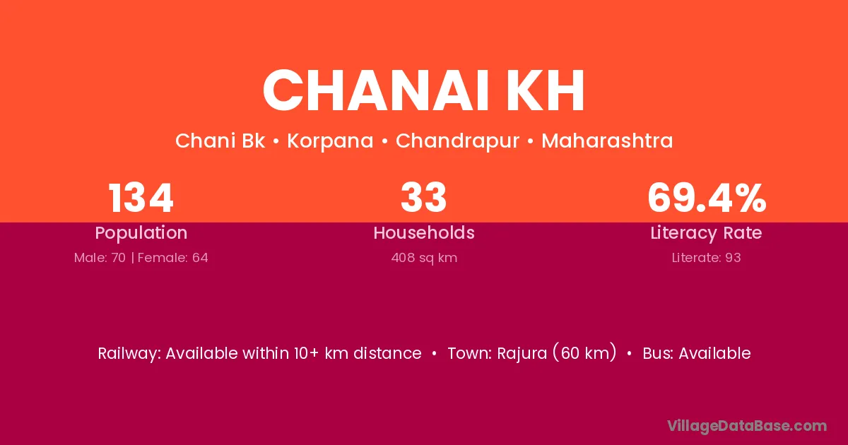 Rajura (60 km) is the nearest town to Chanai Kh village for major economic activities and is located approximately 60 km away.