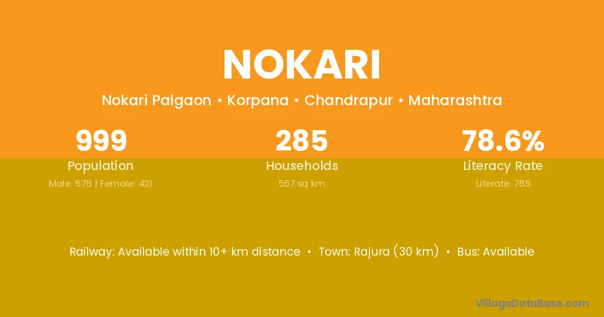 Rajura (30 km) is the nearest town to Nokari village for major economic activities and is located approximately 30 km away.