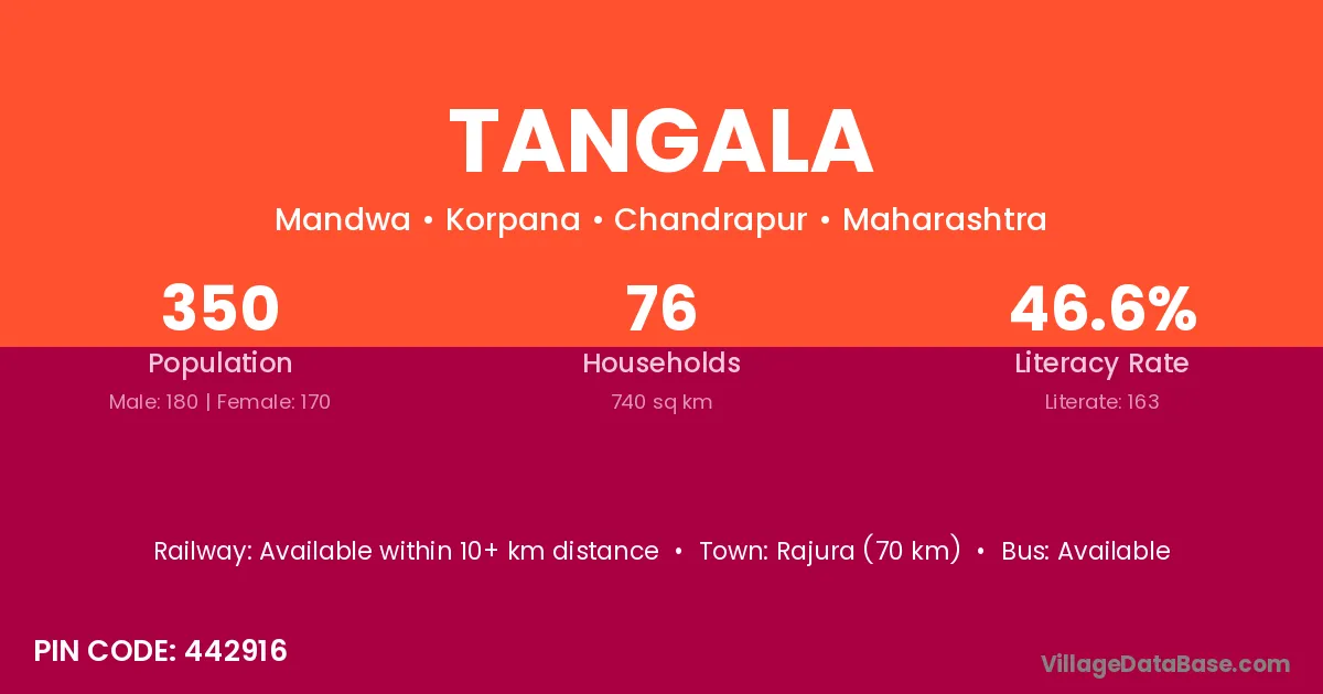 Rajura (70 km) is the nearest town to Tangala village for major economic activities and is located approximately 70 km away.
