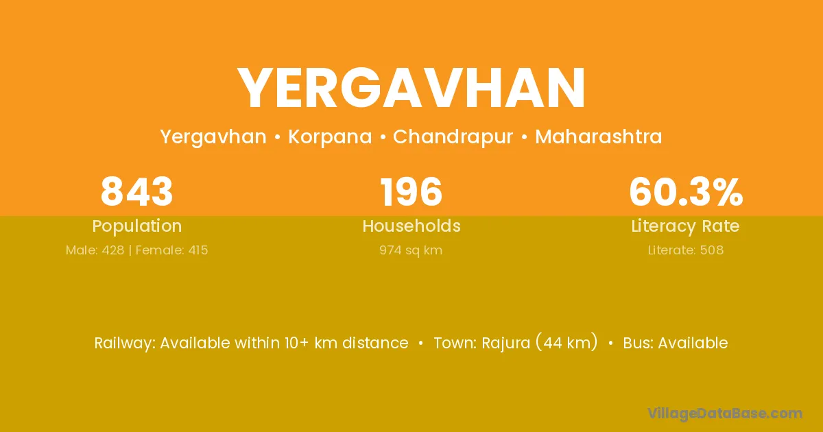 Rajura (44 km) is the nearest town to Yergavhan village for major economic activities and is located approximately 44 km away.