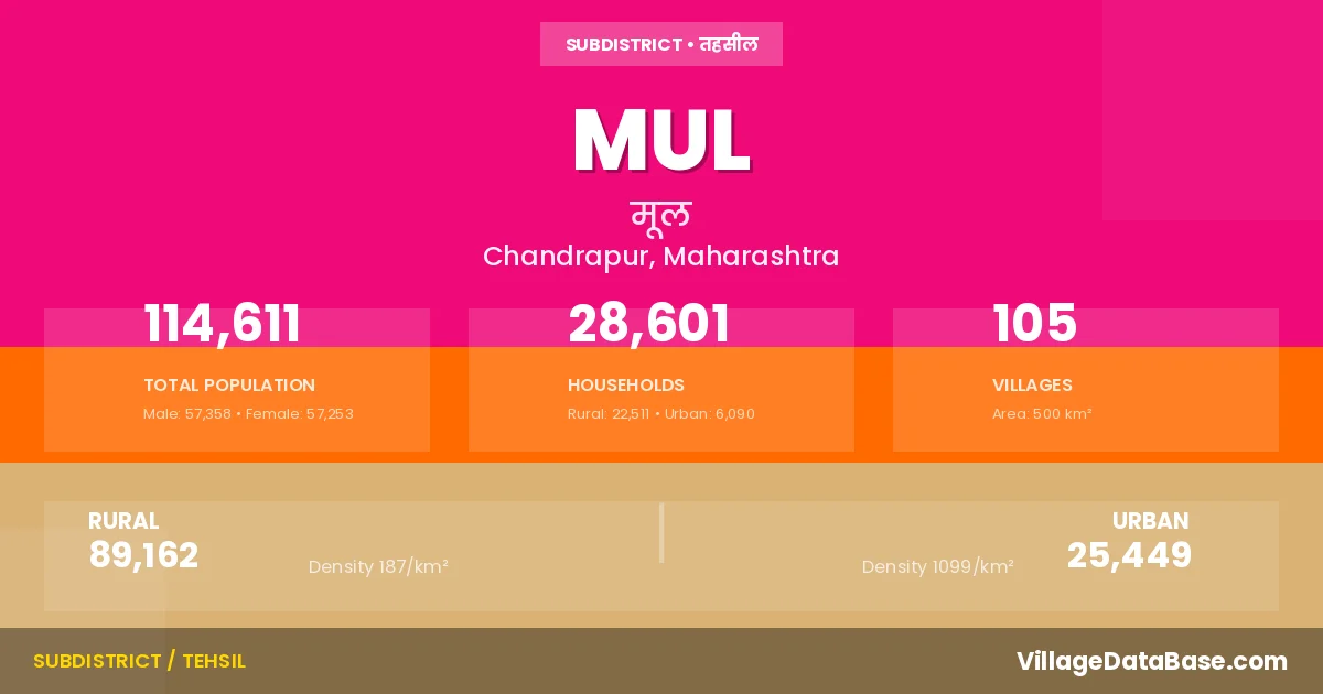 According to the 2011 census The total area of Mul Tehsil is 500 km², with a population of 114611 people. The population density is 229 inhabitants per square kilometre, and there are approximately 28601 houses in the sub district.