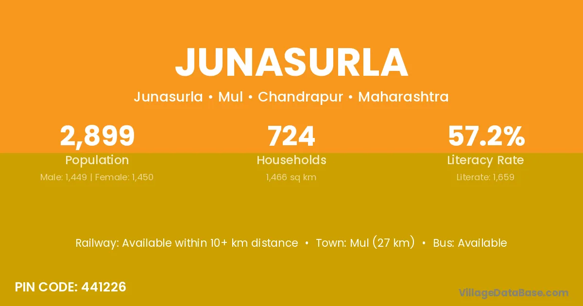 Mul (27 km) is the nearest town to Junasurla village for major economic activities and is located approximately 27 km away.