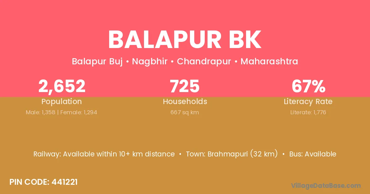 Brahmapuri (32 km) is the nearest town to Balapur Bk village for major economic activities and is located approximately 32 km away.