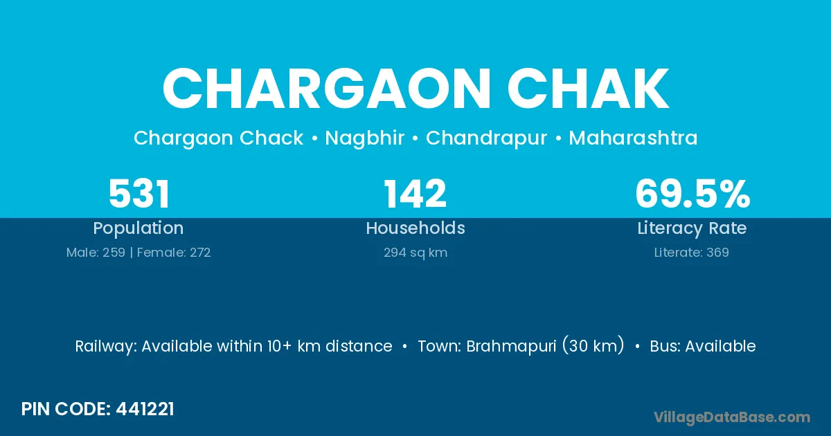 Brahmapuri (30 km) is the nearest town to Chargaon Chak village for major economic activities and is located approximately 30 km away.