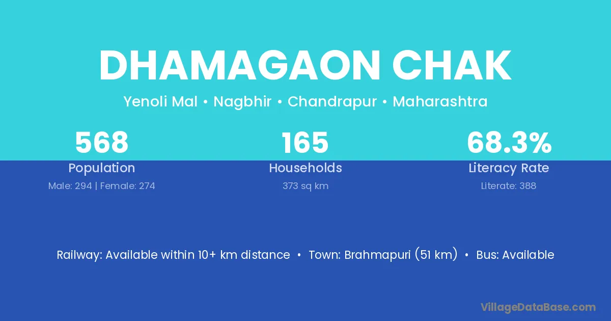 Brahmapuri (51 km) is the nearest town to Dhamagaon Chak village for major economic activities and is located approximately 51 km away.