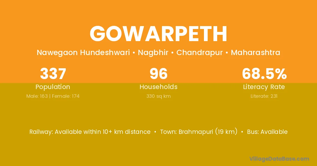 Brahmapuri (19 km) is the nearest town to Gowarpeth village for major economic activities and is located approximately 19 km away.