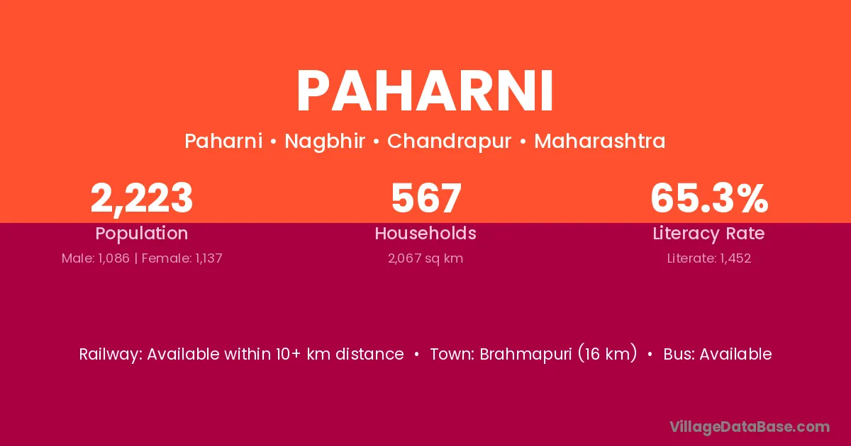 Brahmapuri (16 km) is the nearest town to Paharni village for major economic activities and is located approximately 16 km away.