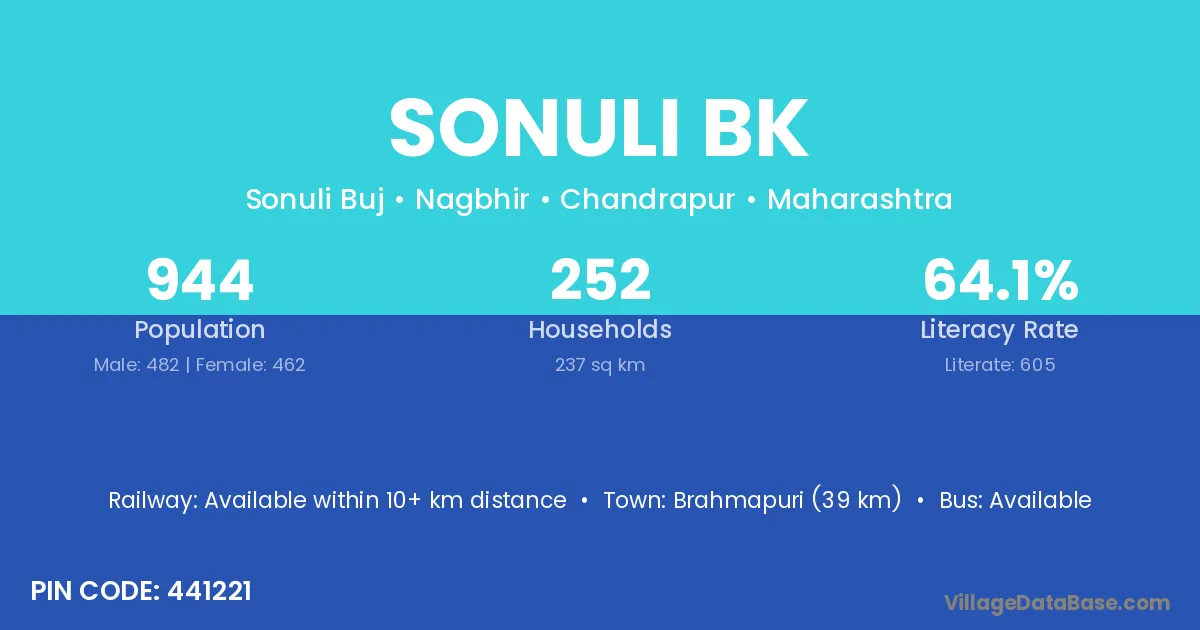 Brahmapuri (39 km) is the nearest town to Sonuli Bk village for major economic activities and is located approximately 39 km away.